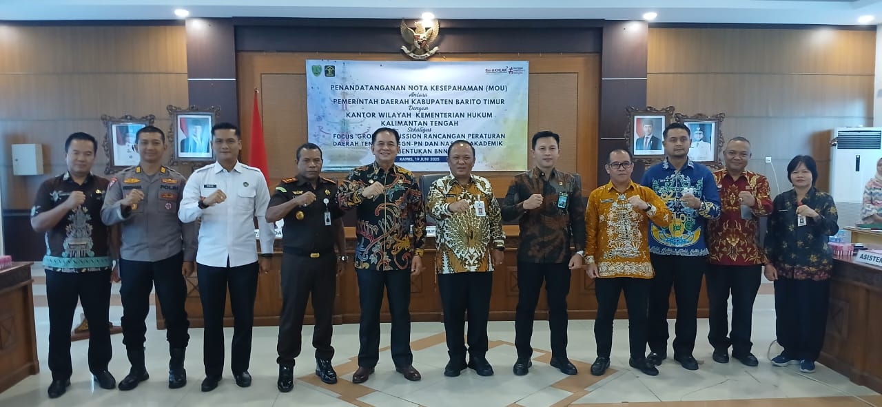Tamiang Layang – Pemerintah Kabupaten Barito Timur, dan Kantor Wilayah Kementerian Hukum dan HAM Provinsi Kalimantan Tengah melakukan penandatanganan Nota Kesepahaman (MoU) bersama, di Ruang Rapat Bupati Bartim, Kamis (19/6/2025).