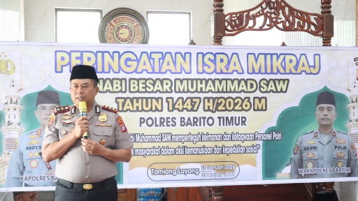 Tamiang Layang – Jajaran Polres Barito Timur (Bartim) menggelar peringatan Isra Mi’raj Nabi Muhammad SAW 1447 Hijriah di Masjid Al-Harist Polres Bartim, Senin (19/1/2026).