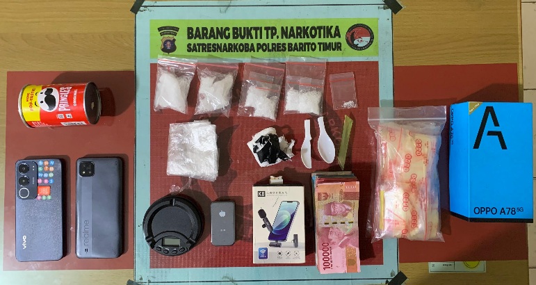 Selain sabu, polisi juga menyita dua unit timbangan digital, plastik klip, sendok yang diduga digunakan untuk mengemas sabu, uang tunai jutaan rupiah, dua unit telepon genggam, serta sepeda motor yang digunakan pelaku.