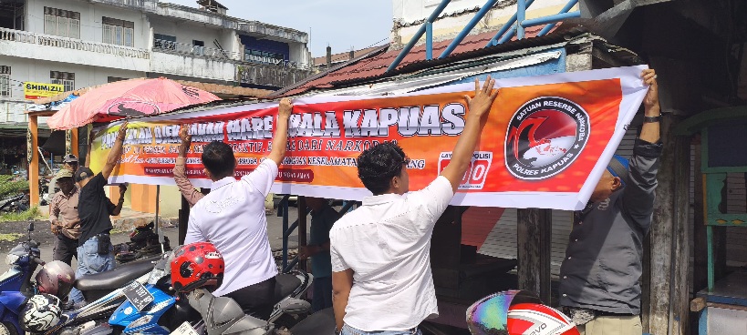 Kasat Resnarkoba Polres Kapuas AKP Budi Utomo bersama personel turun langsung melakukan pemasangan spanduk sebagai langkah preventif untuk mencegah penyalahgunaan narkotika di tengah masyarakat.